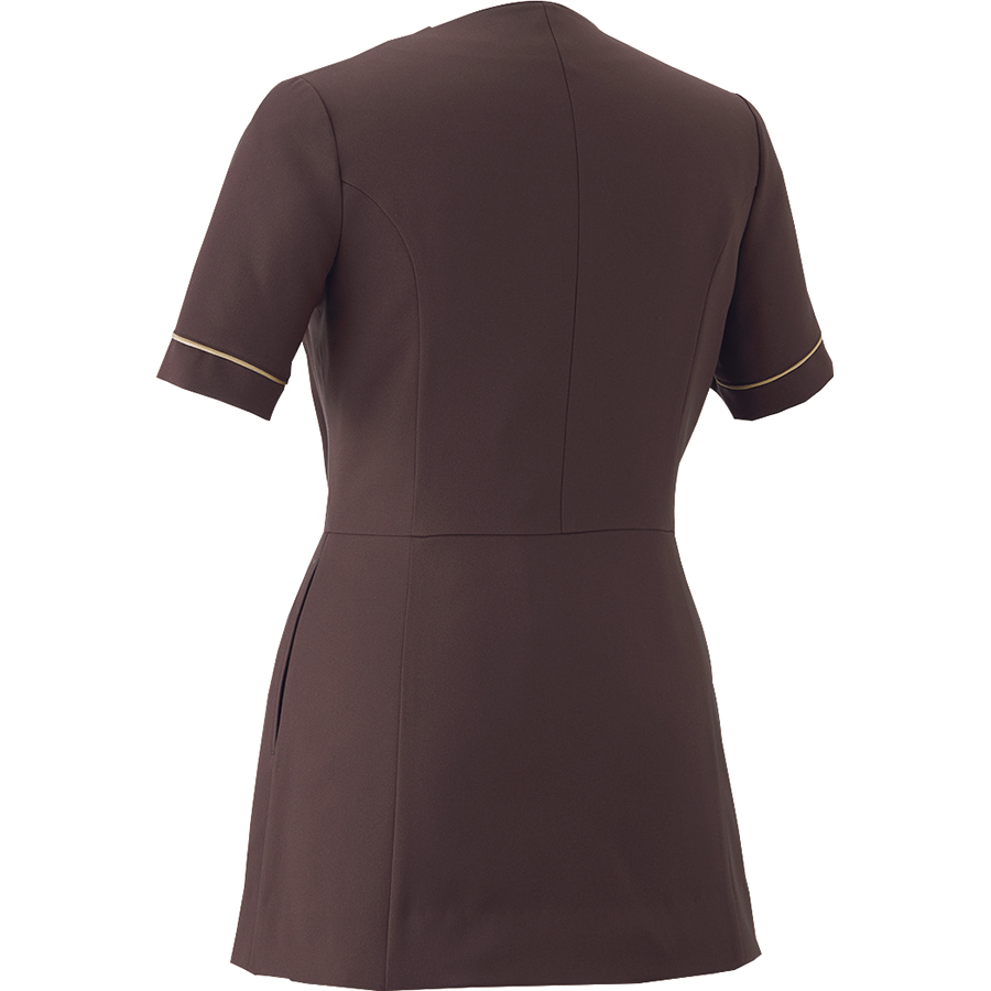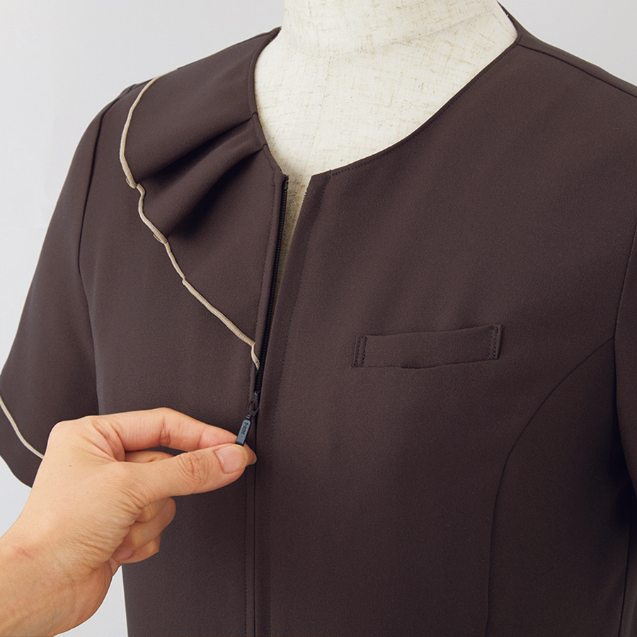 - ラッフルデザイン、前ファスナー仕様、左胸ポケット(名札ループ付)、両脇ポケット