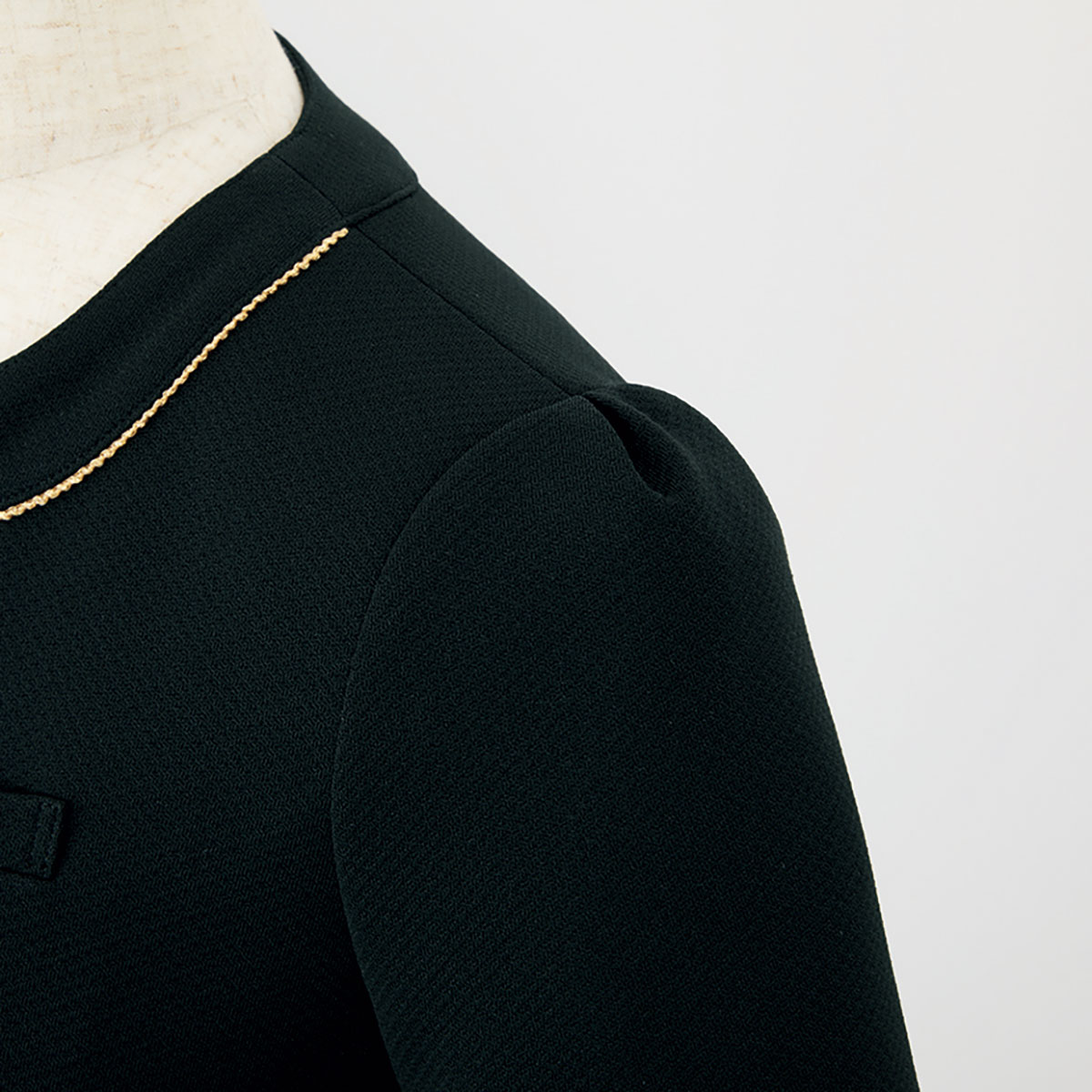 - 左胸ポケット、両脇ポケット、フロントファスナー、きらめきパイピング、肩にアクセントタック、裏地無し