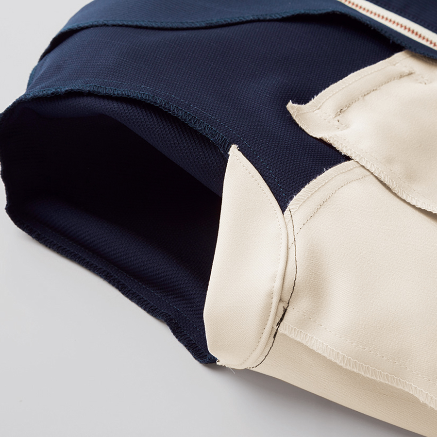 - 前ファスナー、左胸ポケット(名札ポケット付)、両腰ポケット(大容量2重ポケット)、裏地無し、ウエスト切換え、ケアマチ仕様