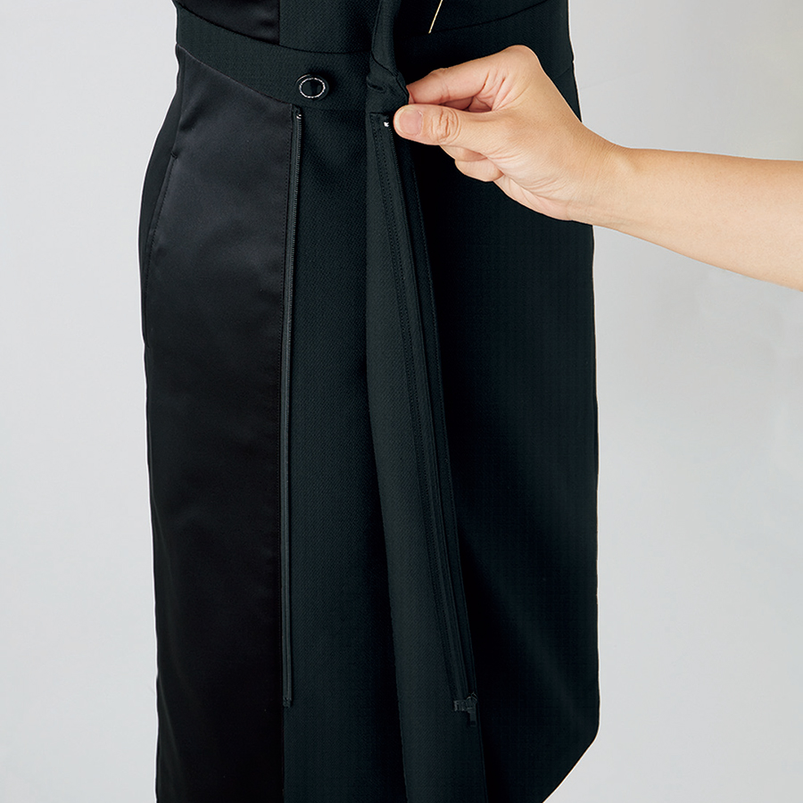 - 左胸ポケット(名札ポケット付)、着崩れ防止のスナップボタン付き、ファスナー仕様、両脇ポケット
