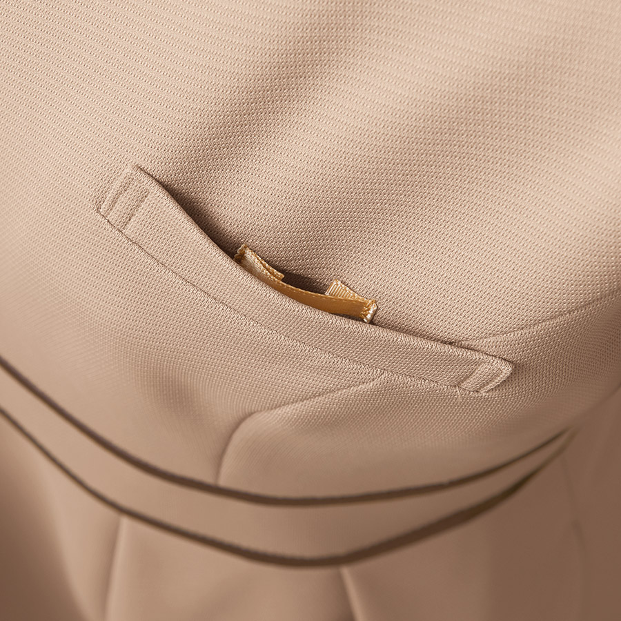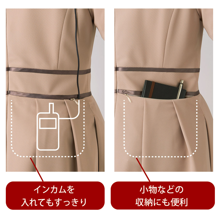インカムを入れてもスッキリ。ウエスト背面にインカムやメモ帳が入るポケット付き。ファスナー付きで目立たないため、見た目はスッキリ。