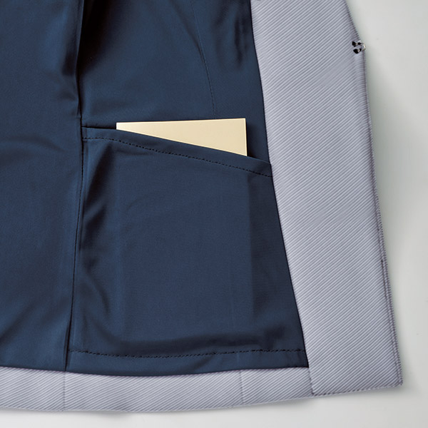 - 総裏、左胸ポケット、両腰ポケット、左胸内ポケット、両腰内ポケット、袖口リターン可、センターベント、名札ループ、アームホールに消臭テープ付