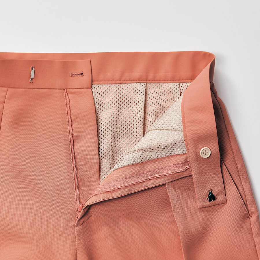 短めの着丈でワイドなシルエットながらウエスト部分を絞り、メリハリのあるパンツ。