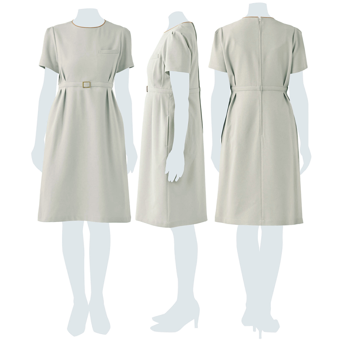 襟もとのパイピングとウエストのゴールドのバックルが華やか度をUPさせています。