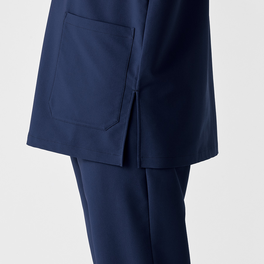 2本のアームラインが清楚かつスタイリッシュな印象を与える男女兼用スクラブ。大き目のポケットあわせで抜け感をプラス。