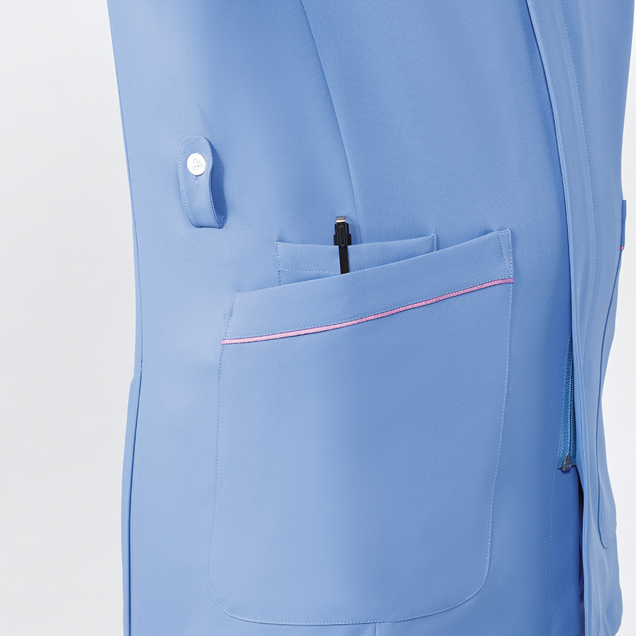 - フロントファスナーあき、左胸ポケット、両脇ポケット(中ポケット付)、ウエストループ付、サイドベンツ、袖下ゴム入り