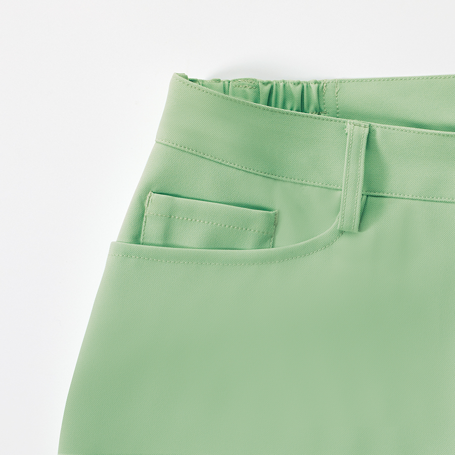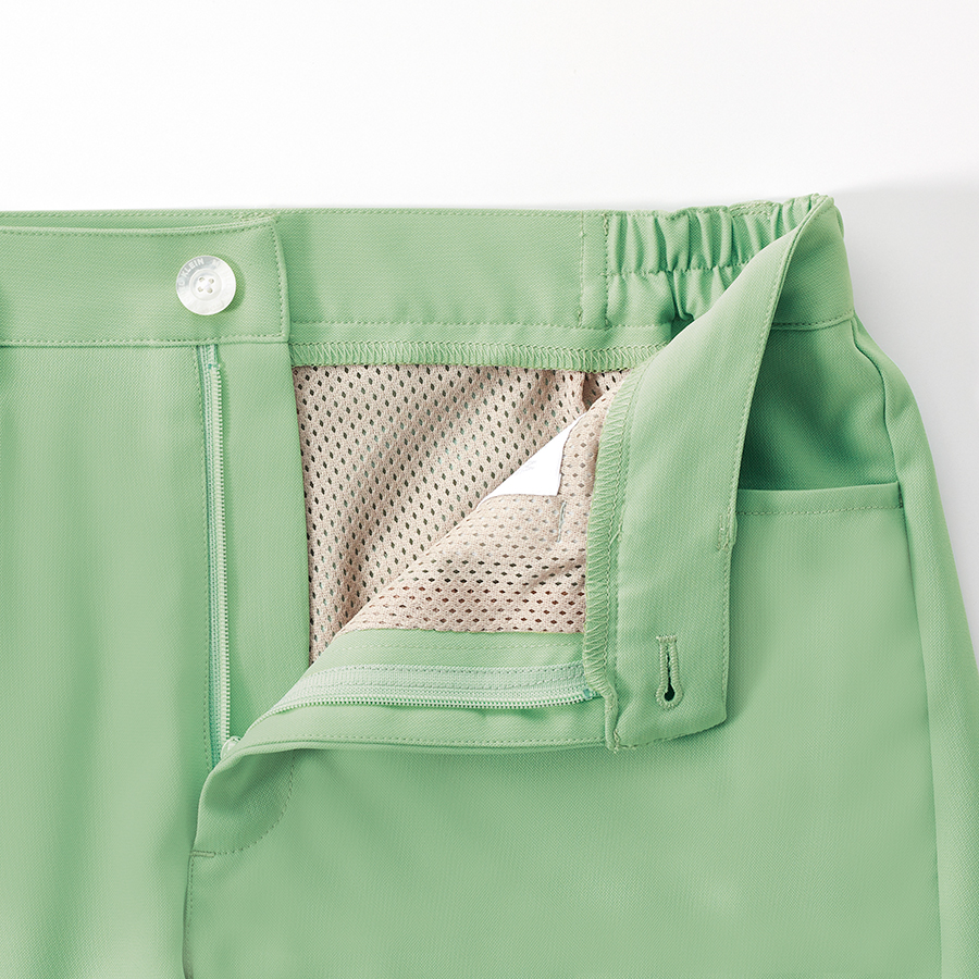 - 前ファスナーあき、ウエスト脇ゴム、メッシュ裏地付、両脇ポケット(右のみ中ポケット付)、左右ヒップポケット