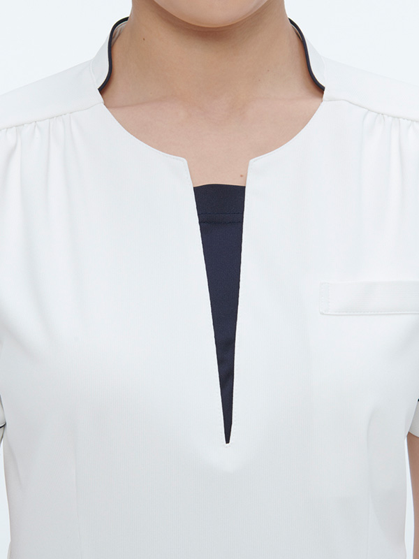 小さめの衿と、ギャザーが入った女性らしいデザインです。胸元のネイビーの配色が、爽やかできちんとした印象を与えます。▼▽▼ 商品の詳細情報はナガイレーベン公式サイトよりご覧いただけます ▼▽▼