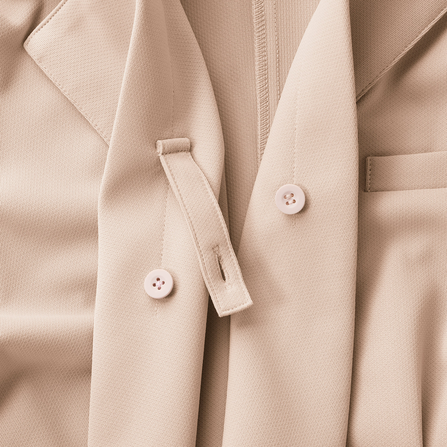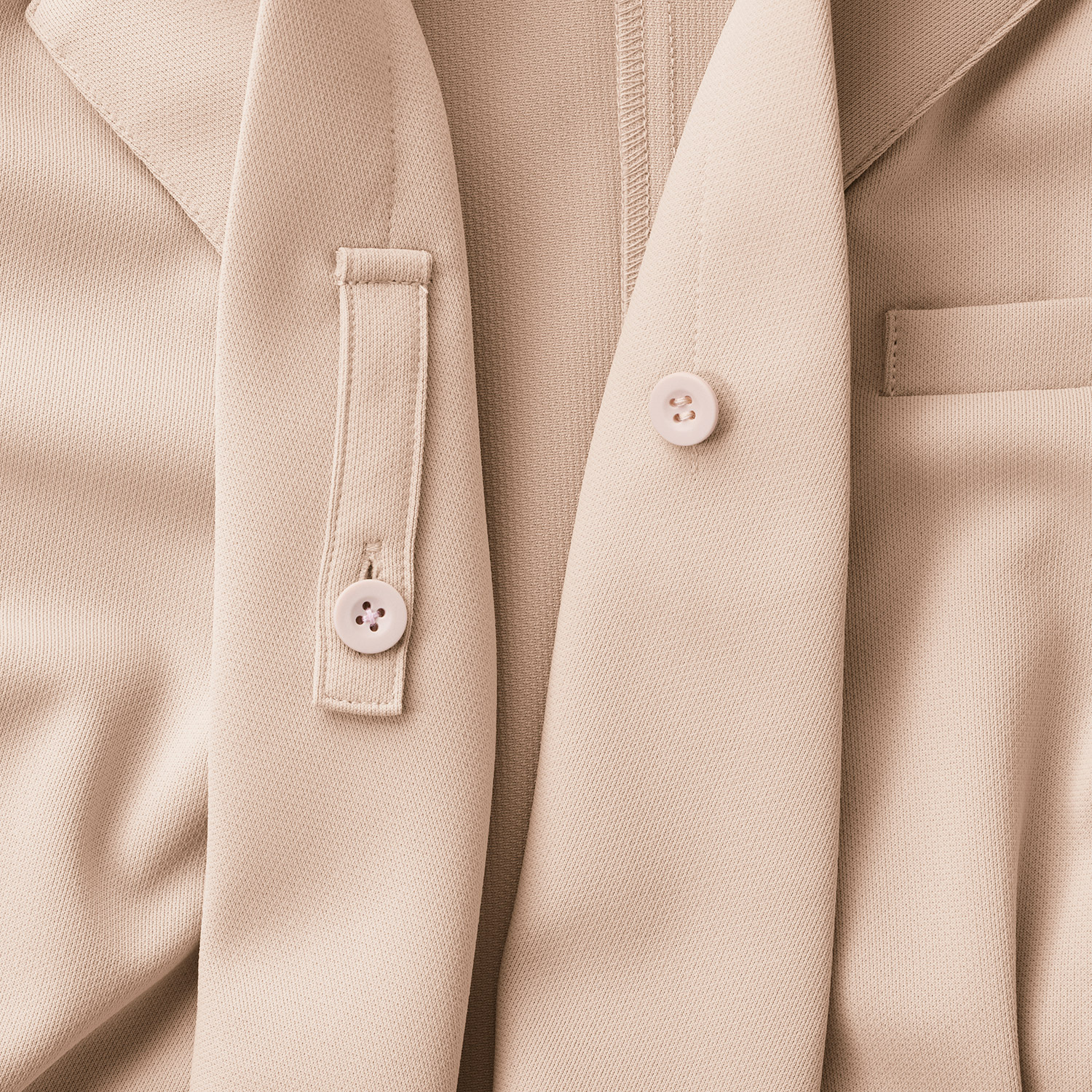 - 左胸ポケット、両脇ポケット、襟元開き防止タブ、袖口スリット、後ろベント