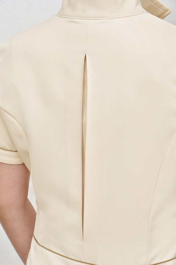スタンドカラーの衿もとがクールです。