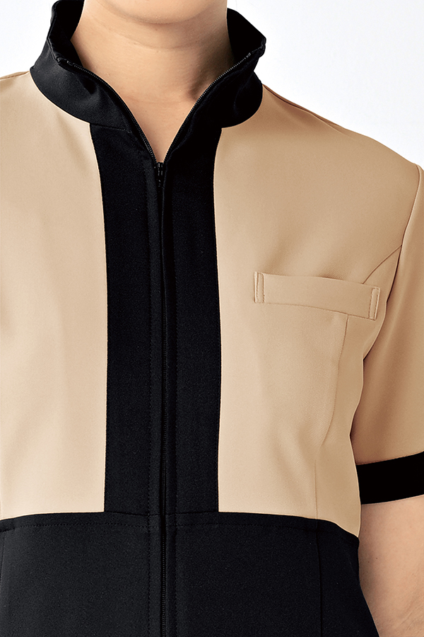 - 左胸・両腰ポケット、前ファスナー開き、胸ポケット内側共布ループ付