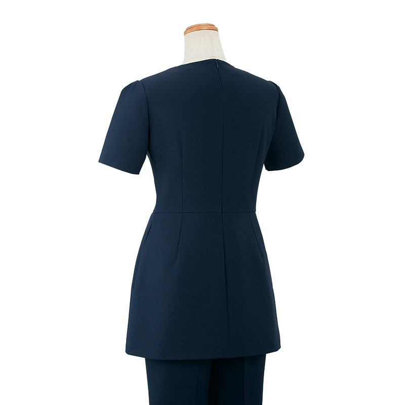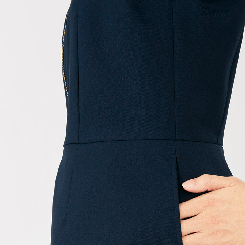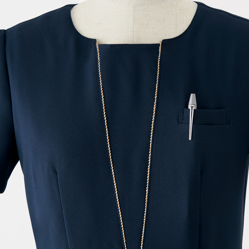 - 後ろファスナー仕様、左胸ポケット(名札ポケット付)、両脇ポケット(抗ウイルス加工)