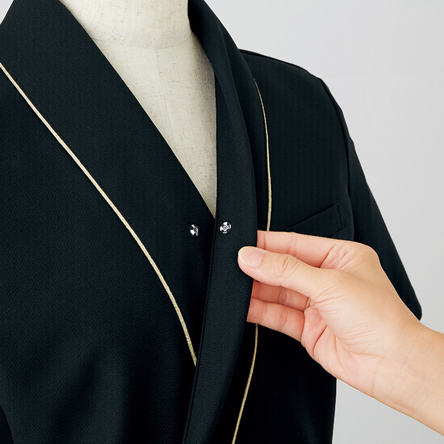 - 左胸ポケット(名札ポケット付)、着崩れ防止のスナップボタン付き、ファスナー仕様、両脇ポケット