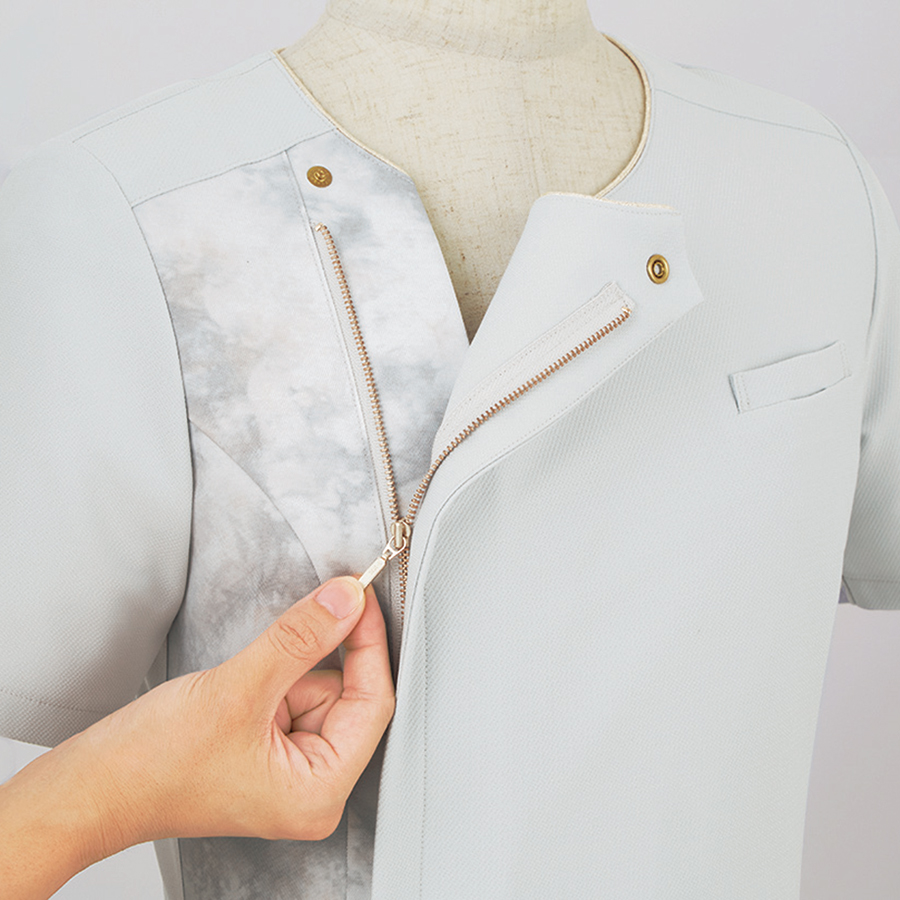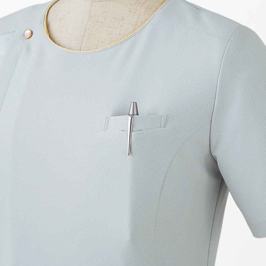 オールシーズン、ホームクリーニング、吸汗速乾、表地:2WAYストレッチ、名札ポケット付、配色:両脇ポケット、UVカット、接触冷感