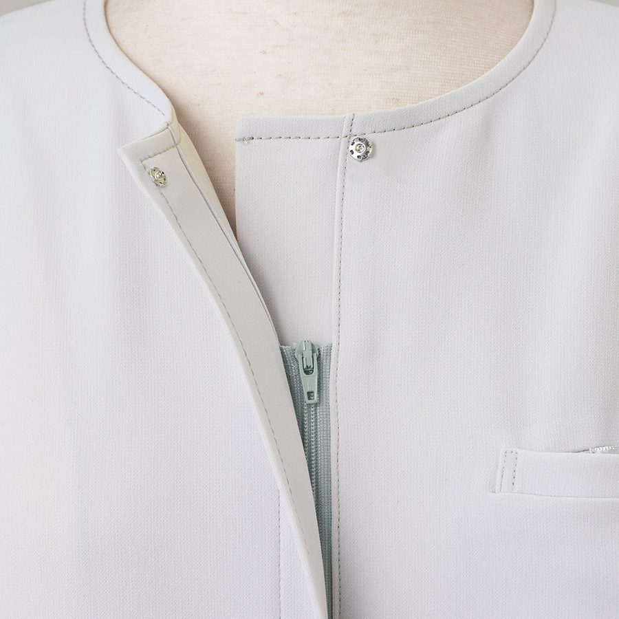 - 左胸ポケット(内名札ループ付)、両腰ポケット、ウエスト後ろゴム仕様、前ファスナー開き、アームホールに消臭テープ付