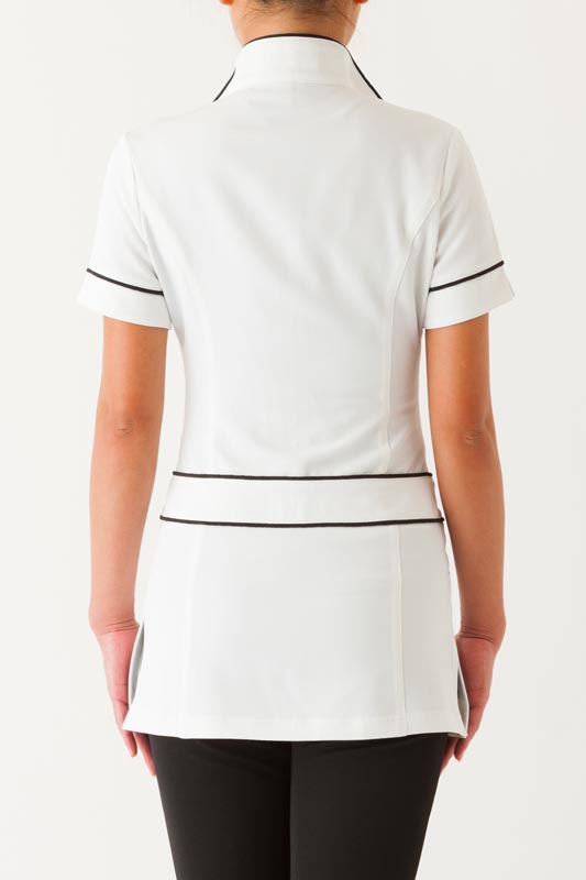 白地に黒のパイピングテープは、はっきりしたコントラストがシャープなイメージをもたらし清潔感のある女性を演出してくれます。