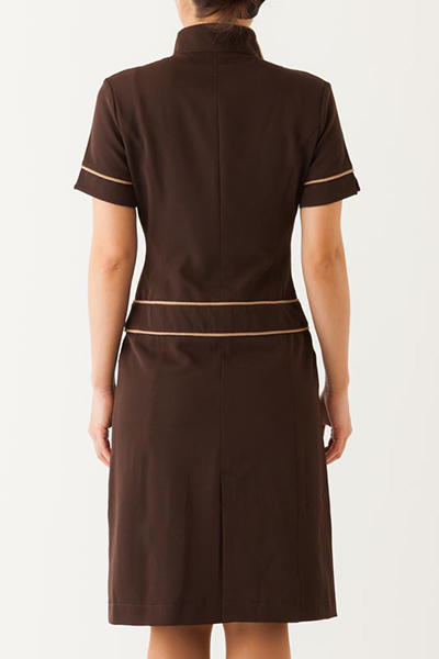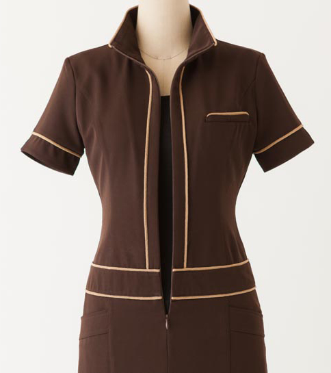 クールな装いのスタンド襟と配色パイピングテープが美しくすっきりとしたラインを演出します。