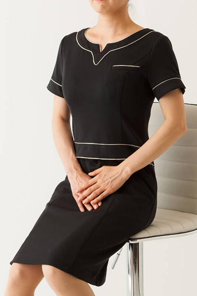 左胸・両腰ポケット、後ろファスナー、ストレッチ裏地付(スカート部分)