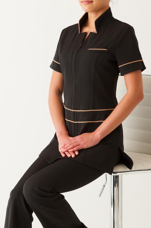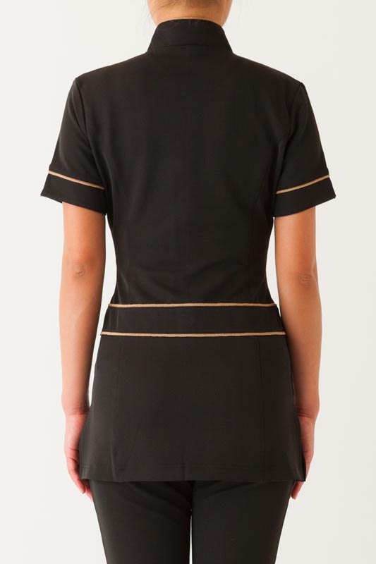 スタンダードな黒には上品なベージュのパイピングテープを施すことにより、落ち着いた女性の印象をあたえます。