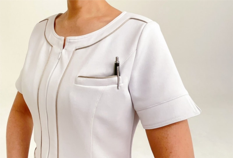 左胸ポケットと両脇に腰ポケットがあり、ペンやスマートホンもらくらく収納できて便利です。