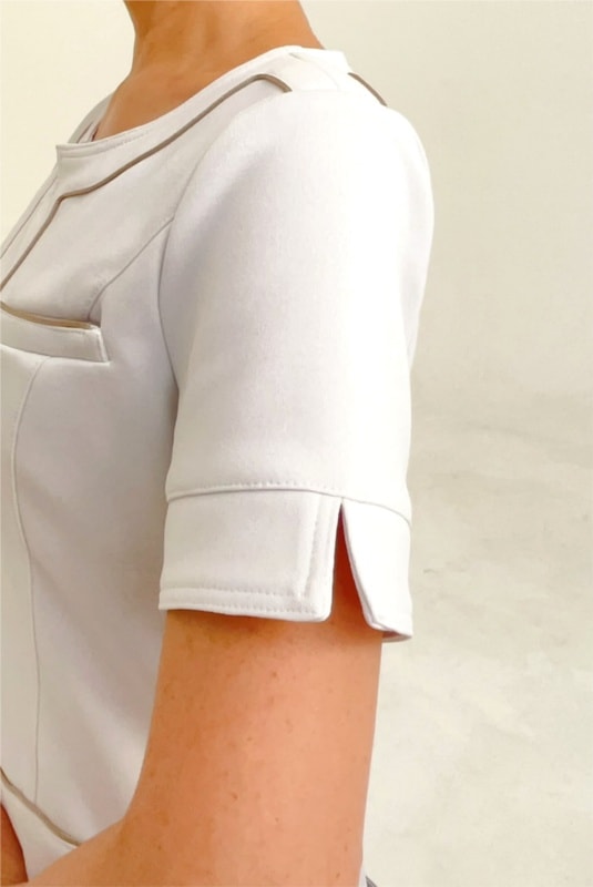 白地に光沢のあるベージュのパイピングテープは軽やかさと上品なイメージを与えてくれます。