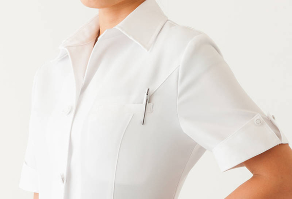 左胸ポケットと両脇に腰ポケットがあり、ペンや大きめのスマートホンもらくらく収納できて便利です。