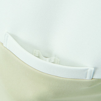 - 左胸ポケット、後ろファスナー開き、アームホールに消臭テープ付き、名札ループ