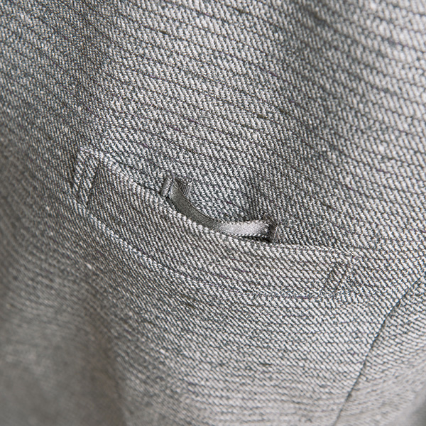 身頃端とポケットに施したパイピングが適度に表情を引き締めます。