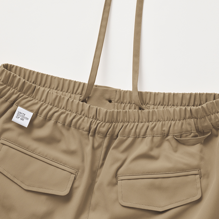 - ウエストゴム・ヒモ入り、両脇ポケット、左右ヒップポケット、右後ろループ付、前ファスナーあき