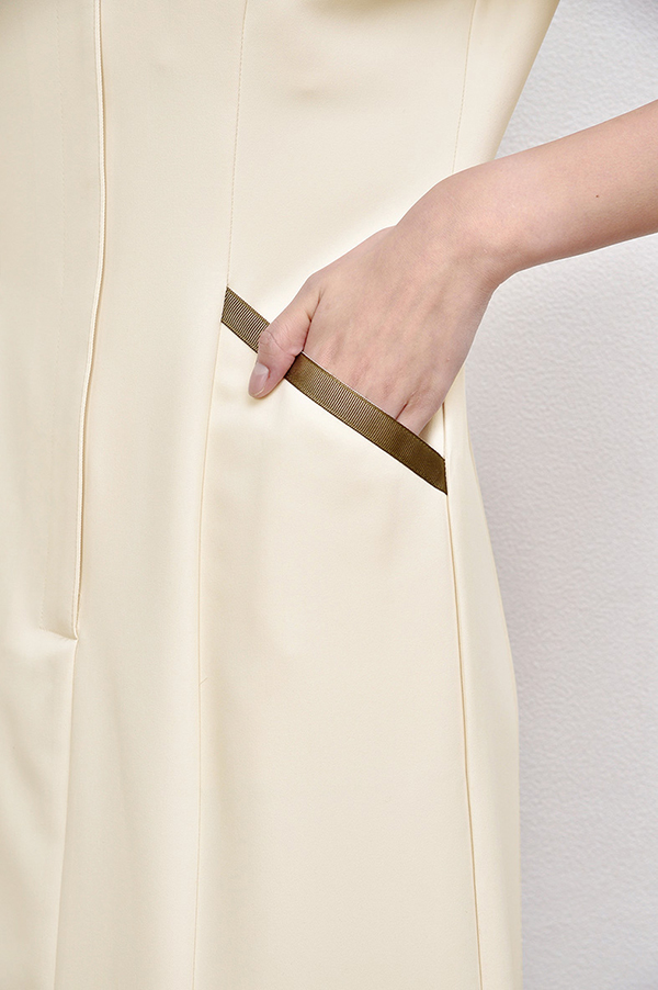 袖口とポケット口にあしらった光沢のあるリボンテープが贅沢な雰囲気に見せてくれます。