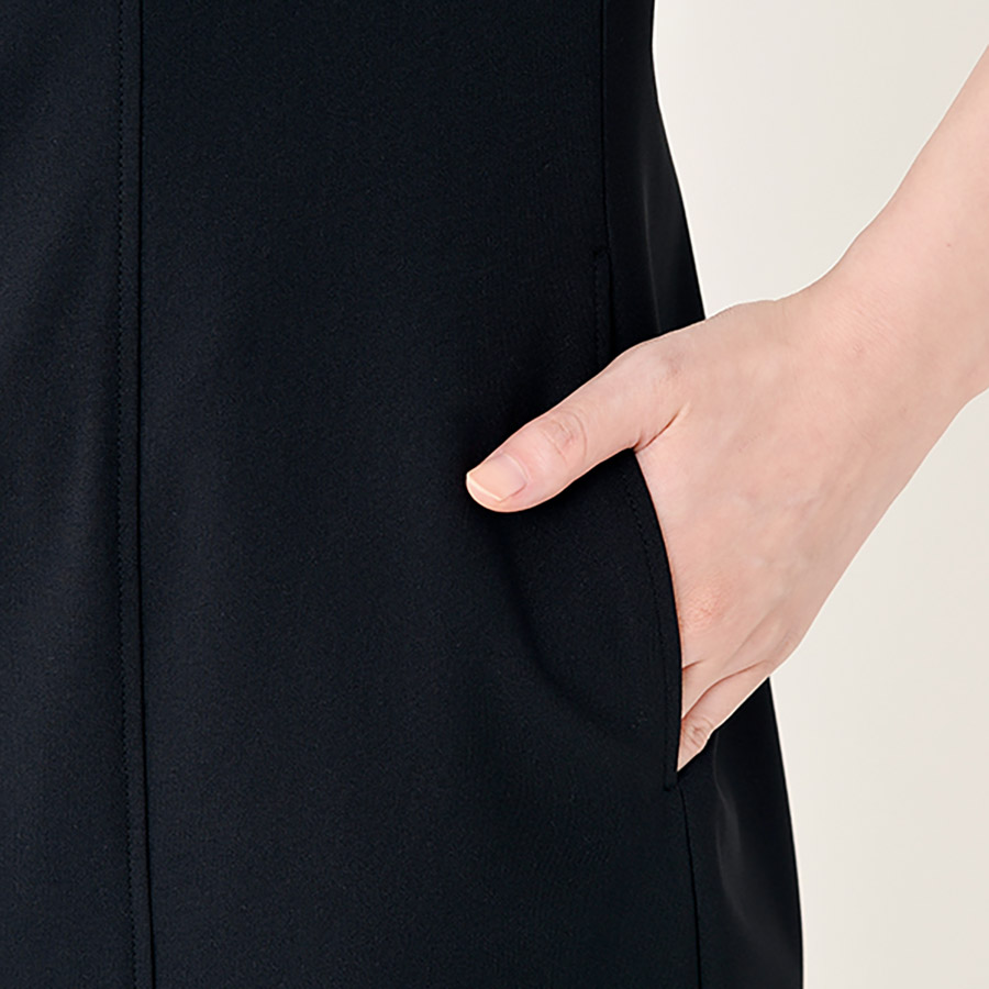 - 左胸・両脇ポケット、後ろファスナー開き、胸ポケット内側共布ループ付、後ろ裾ベンツ