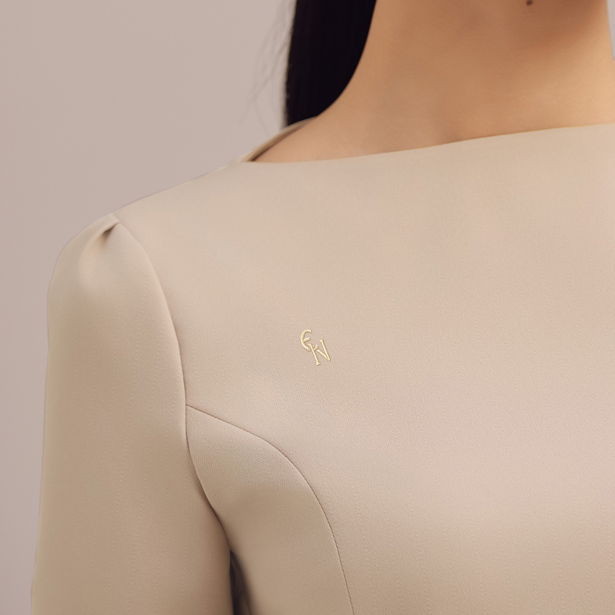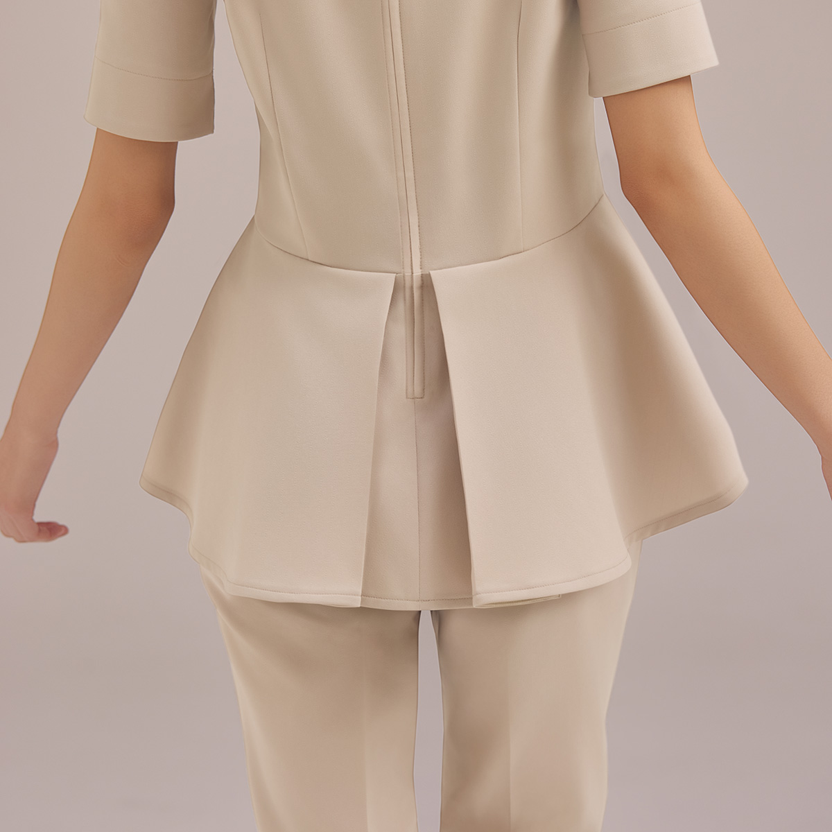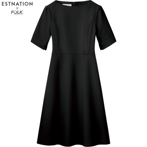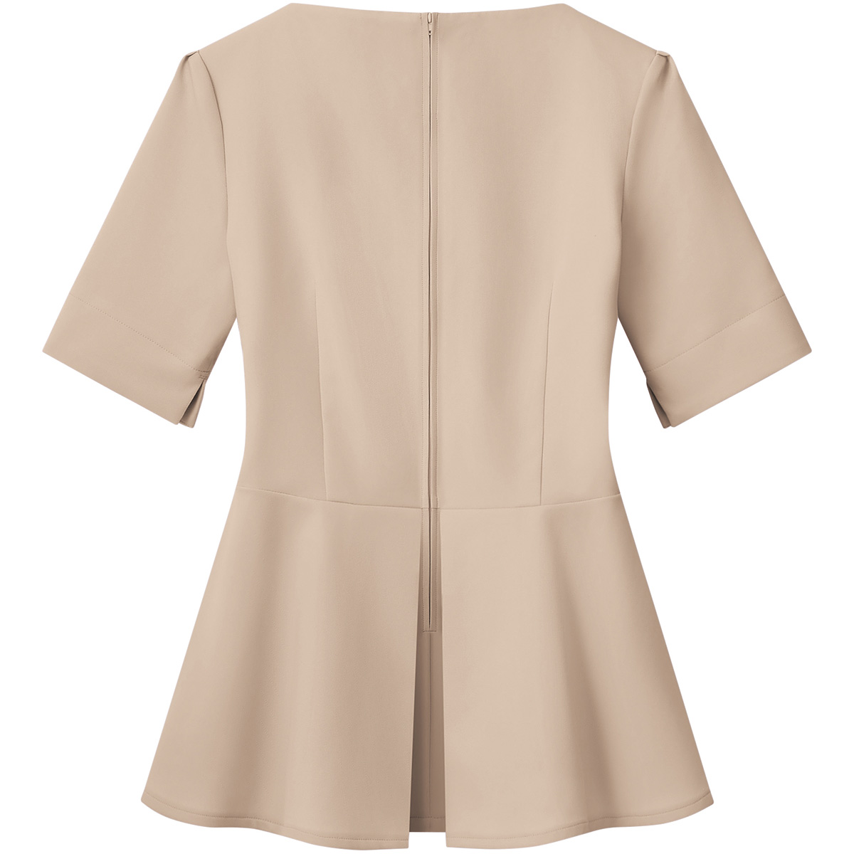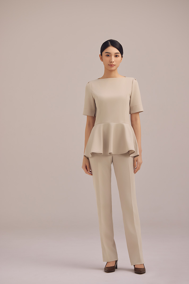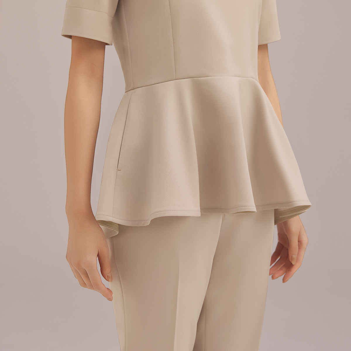 ウエストの切り替えから広がるペプラムシルエットが洗練された美しさと体型カバーを両立します。
