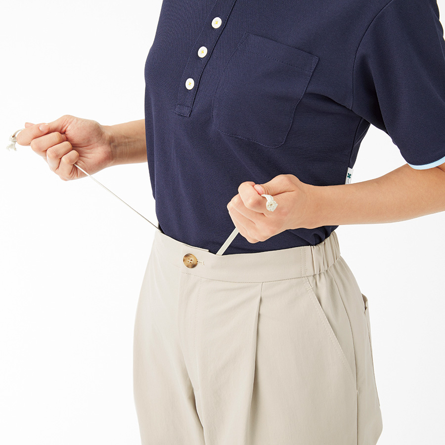 しゃがんでも窮屈感のないストレッチや、ウエストの総ゴム&スピンドルなど機能面も充実し、ストレスゼロの着心地です。