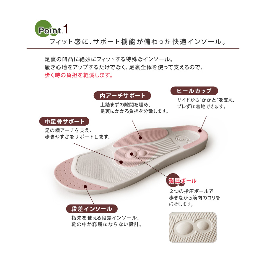 インソールの土踏まず部分には<指圧ボール>があしらわれ足の凹凸に沿ってツボにはまるように絶妙にフィット!