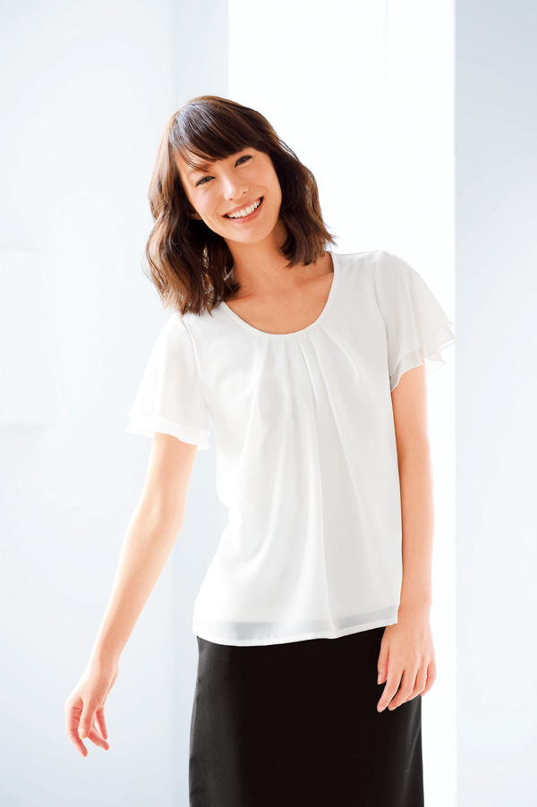【HOW CounterBiz/ハネクトーン早川株式会社-WP324-7】フリル袖タックブラウスT(ホワイト)【ドライミー】