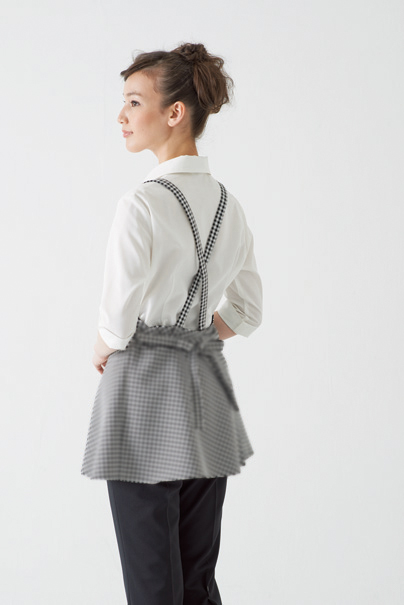 チェック柄のエプロンで可愛いショップスタイル完成。