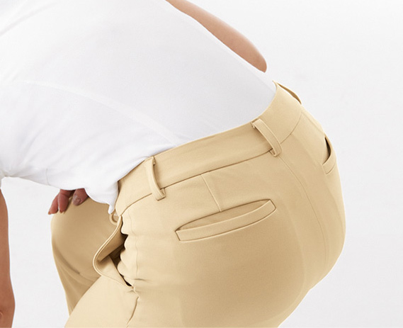 - ストレッチカーブインベル、股上深め、ベルトループ、前ファスナー開き、すべり止め、両脇ポケット、左右後ろポケット、両裾スリット